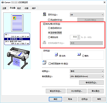 如果已在应用程序软件中设置可选尺寸,则在页尺寸的自定义纸张中选择自定义大小,然后在显示的对话框中指定尺寸。选择卷纸宽度