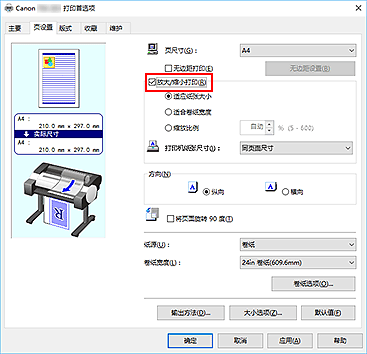 - 当用于创建原稿的应用程序软件具有比例打印功能时,请在该应用程序软件上配置此设置。 您无需在打印机驱动程序中配置相同的设置。