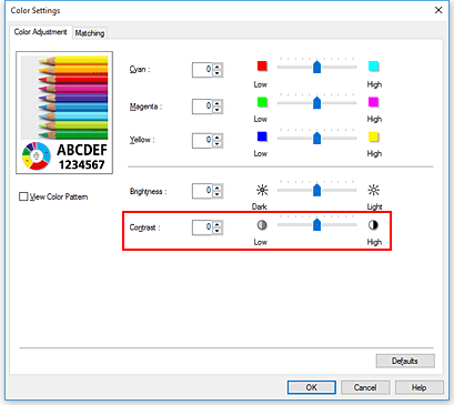 En la ficha Ajuste de color (Color Adjustment), al desplazar el control deslizante Contraste (Contrast) hacia la derecha, aumentará el contraste y, al desplazarlo hacia la izquierda, disminuirá.