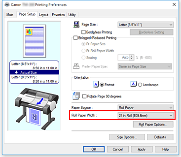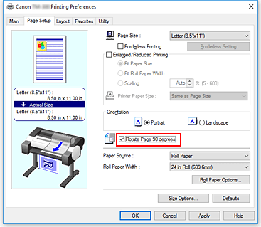 - Al seleccionar papel en formato vertical como Tamaño de página (Page Size) en la ficha Configurar página (Page Setup), si el largo en dirección vertical es de mayor longitud que la anchura seleccionada en Anc. Rollo (Roll Width), incluso si se ha colocado una marca de verificación junto a Girar página 90 grados (Rotate Page 90 degrees), la página no se girará.