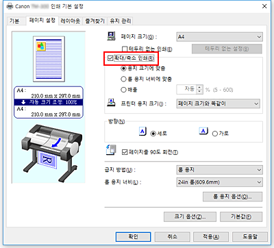 • 원본을 작성하는 데 사용한 어플리케이션 소프트웨어에 배율 인쇄 기능이 있으면 어플리케이션 소프트웨어에서 설정을 구성하십시오. 프린터 드라이버에서 같은 설정을 구성할 필요는 없습니다.