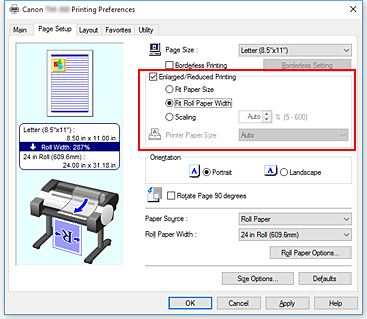 Marque Impressão ampliada/reduzida (Enlarged/Reduced Printing) e selecione Aj. larg. papel rolo (Fit Roll Paper Width).