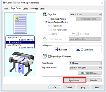 2. Clique em Opções de tam... (Size Options...) na guia Configurar Página (Page Setup)