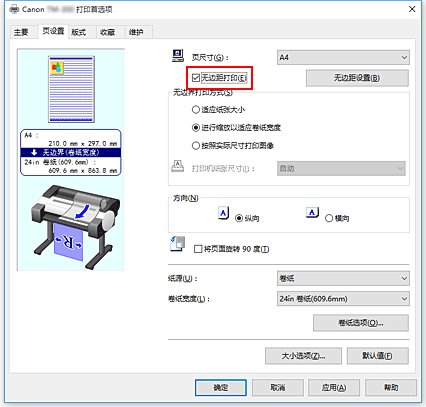 - 如果选择不支持无边距打印的纸张尺寸,会将其替换为支持整面无边距打印的尺寸。