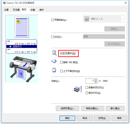 如果希望将源文档置于单页纸中央进行打印,或者相对于卷纸宽度左右等边距打印,请使用打印居中功能。