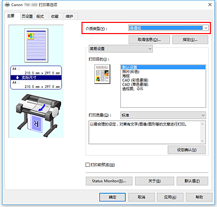 从主要选项卡的介质类型列表中选择装入打印机的纸张类型。