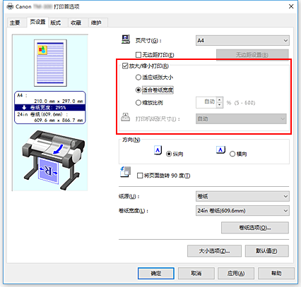 如果已在应用程序软件中设置可选尺寸,则在页尺寸的自定义纸张中选择自定义大小,然后在显示的对话框中指定尺寸。选择卷纸宽度