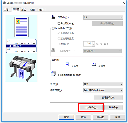 从页设置选项卡的页尺寸列表中,选择与使用应用程序软件创建的文档相同的尺寸。