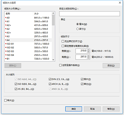 - 要为非标准纸张尺寸设置超大纸张尺寸,请在纸张大小选项对话框中注册纸张尺寸。 无法为在自定义大小设置对话框中设置的纸张尺寸设置超大纸张尺寸。