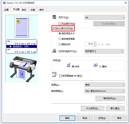 - 当用于创建原稿的应用程序软件具有比例打印功能时,请在该应用程序软件上配置此设置。 您无需在打印机驱动程序中配置相同的设置。