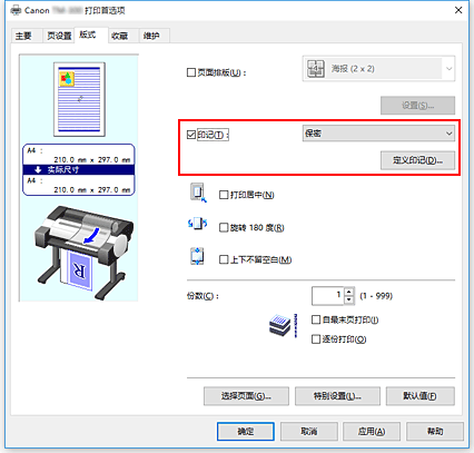 在版式选项卡上,选中印记复选框,然后从列表中选择要使用的印记。