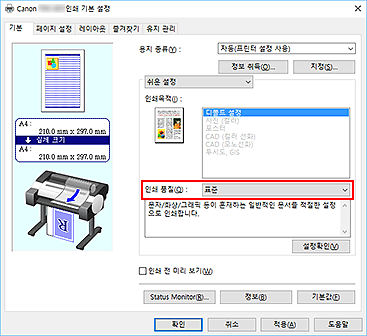 - 프린터 드라이버의 용지 설정이 프린터에 등록된 용지 정보와 다른 경우 프린터 조작판에 오류 메시지가 나타날 수 있습니다. 인쇄를 실행할 수는 있지만 올바른 인쇄 결과를 얻지 못할 수 있습니다.