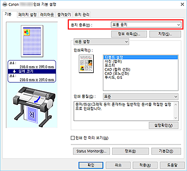 기본(Main) 탭의 용지 종류(Media Type) 목록에서 프린터에 로드된 용지의 종류를 선택합니다.