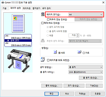 페이지 설정(Page Setup) 탭의 페이지 크기(Page Size) 목록에서 어플리케이션 소프트웨어를 사용하여 만든 문서와 같은 크기를 선택합니다.