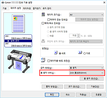 용지 공급(Paper Source)에서 롤 용지를 선택한 경우 롤 용지 너비(Roll Paper Width)를 프린터에 로드된 롤 용지의 너비로 설정합니다.