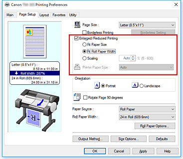Marque Impressão ampliada/reduzida (Enlarged/Reduced Printing) e selecione Aj. larg. papel rolo (Fit Roll Paper Width).