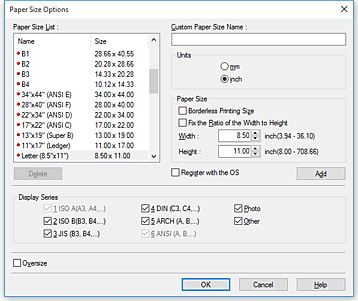 Para estreitar os tamanhos de papel exibidos em Lista de tamanhos de papel (Paper Size List), marque a caixa de seleção Exibir séries (Display Series).