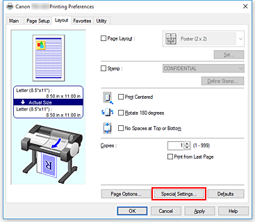 Clique em Configurações especiais... (Special Settings...) na guia Layout