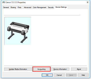 Откроется окно свойств принтера.Нажмите Учет (Accounting) на вкладке Настройки устройства (Device Settings)