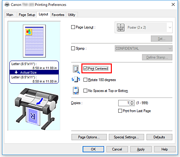 Установите флажок рядом с пунктом Печать по центру (Print Centered) на вкладке Макет (Layout).