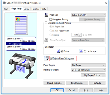 - Если при выборе бумаги в книжной ориентации в разделе Размер стр. (Page Size) на вкладке Страница (Page Setup) длина по вертикали превышает ширину, выбранную для параметра Ширина рулона (Roll Width), даже если для пункта Поворот страницы на 90 градусов (Rotate Page 90 degrees) установлен флажок, страница не будет повернута.