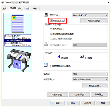 - 如果在无边距打印选项旁添加选中标记,版式选项卡中的页面排版和打印居中选项将显示为灰色且无法设置。