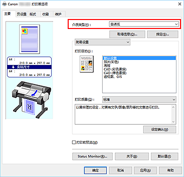 从主要选项卡的介质类型列表中选择装入打印机的纸张类型。