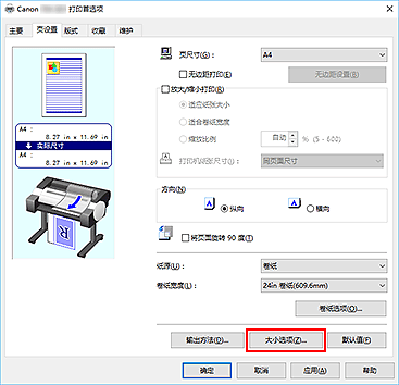 从页设置选项卡的页尺寸列表中,选择与使用应用程序软件创建的文档相同的尺寸。