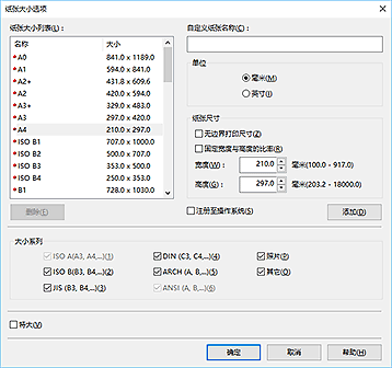 - 要为非标准纸张尺寸设置超大纸张尺寸,请在纸张大小选项对话框中注册纸张尺寸。 无法为在自定义大小设置对话框中设置的纸张尺寸设置超大纸张尺寸。
