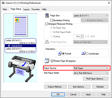 Wenn Sie unter Papierzufuhr (Paper Source) ein Rollenpapier ausgewählt haben, stellen Sie die Rollenpapierbreite (Roll Paper Width) auf die Breite des im Drucker eingelegten Rollenpapiers ein.
