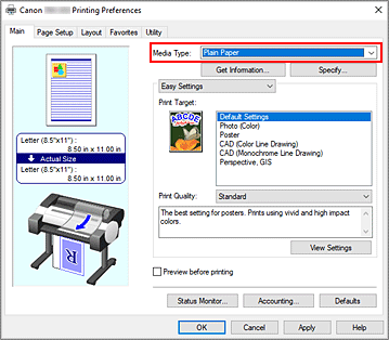 Seleccione el tipo de papel cargado en la impresora en la lista Tipo soporte (Media Type) de la ficha Principal (Main).