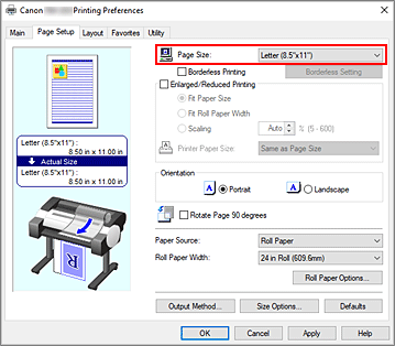 Seleccione el tamaño de papel en el que desea imprimir en Tamaño de página (Page Size) en la ficha Configurar página (Page Setup).
