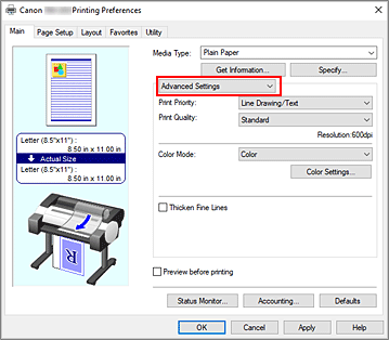 Выберите тип бумаги, загруженной в принтер, в списке Тип носителя (Media Type) на вкладке Главная (Main).