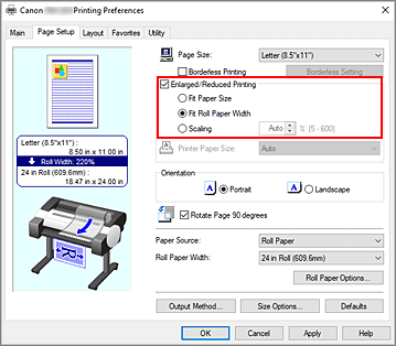 Поставьте флажок для пункта Печать с увеличением/уменьшением (Enlarged/Reduced Printing) и выберите значение По ширине рулона (Fit Roll Paper Width).