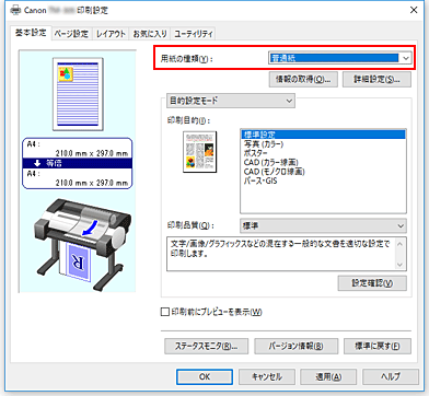 [基本設定]シートの[用紙の種類]で、プリンターにセットしている用紙の種類と同じものを選びます。