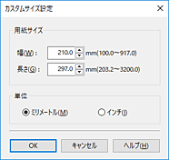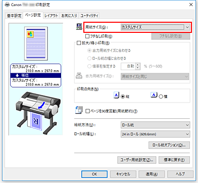 • [カスタムサイズ]で設定した用紙サイズは、アプリケーションソフトを終了すると無効になります。
