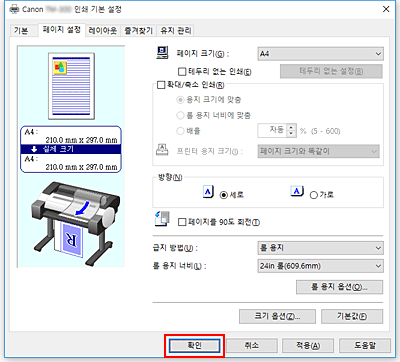 참고- 프린터에 용지 종류와 출력 용지 크기가 설정되지 않은 경우, 확인(OK)은 회색으로 표시되고 클릭할 수 없습니다.