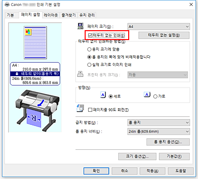- 테두리 없는 인쇄를 지원하지 않는 용지 크기를 선택한 경우 용지 크기가 전체 면에 테두리 없이 인쇄할 수 있는 크기로 교체됩니다.