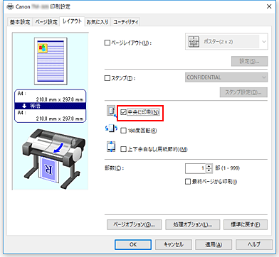 原稿をカット紙の中央に配置して印刷したいときや、ロール紙の幅に対して左右の余白を均等にとって印刷したいときには、[中央に印刷]機能を使用します。