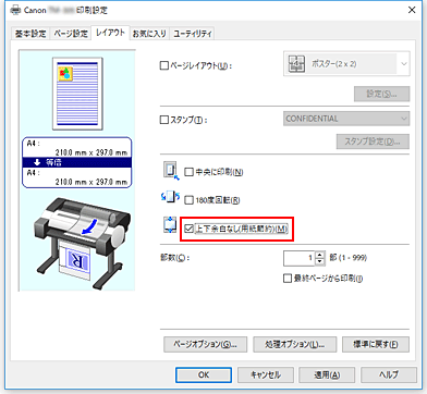 [レイアウト]シートの[上下余白なし(用紙節約)]にチェックマークを付けます。