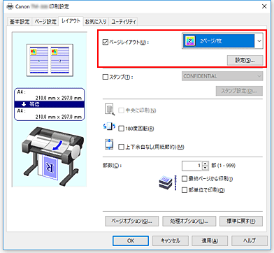 [レイアウト]シートの[ページレイアウト]にチェックマークを付け、プルダウンメニューから、[2ページ/枚]、[4ページ/枚]、[6ページ/枚]、[8ページ/枚]、[9ページ/枚]、[16ページ/枚]のいずれかを選びます。