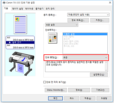 목적에 따라 인쇄 품질(Print Quality)에서 고품질(High), 표준(Standard) 또는 고속(Fast)을 선택합니다.