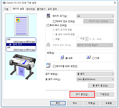 용지 크기 옵션(Paper Size Options) 대화 상자가 열립니다.