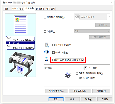 롤 용지에 인쇄하는 경우 상단 및 하단 여백을 줄여 용지를 절약할 수 있습니다.