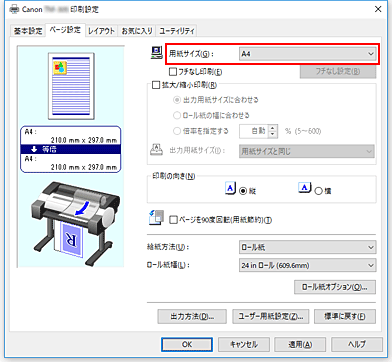 [給紙方法]でロール紙を選んだ場合は、[ロール紙幅]でプリンターにセットしているロール紙の紙幅と同じものを選びます。