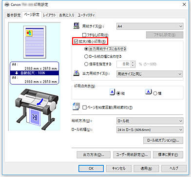- 原稿を作成したアプリケーションソフトに拡大縮小印刷機能がある場合は、アプリケーションソフトで設定してください。プリンタードライバーで設定する必要はありません。