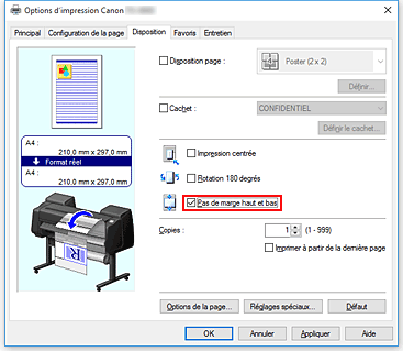 Lorsque vous imprimez sur un rouleau de papier, vous pouvez économiser du papier en réduisant les marges supérieure et inférieure lors de l'impression.