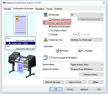 Cochez la case Impression agrandie/réduite.