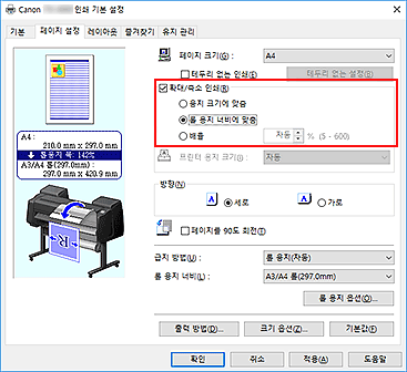 확대/축소 인쇄(Enlarged/Reduced Printing) 확인란을 선택하고 롤 용지 너비에 맞춤(Fit Roll Paper Width)을 선택합니다.