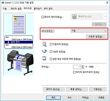 레이아웃(Layout) 탭에서 스탬프(Stamp) 확인란을 선택한 다음 목록에서 사용할 스탬프를 선택합니다.